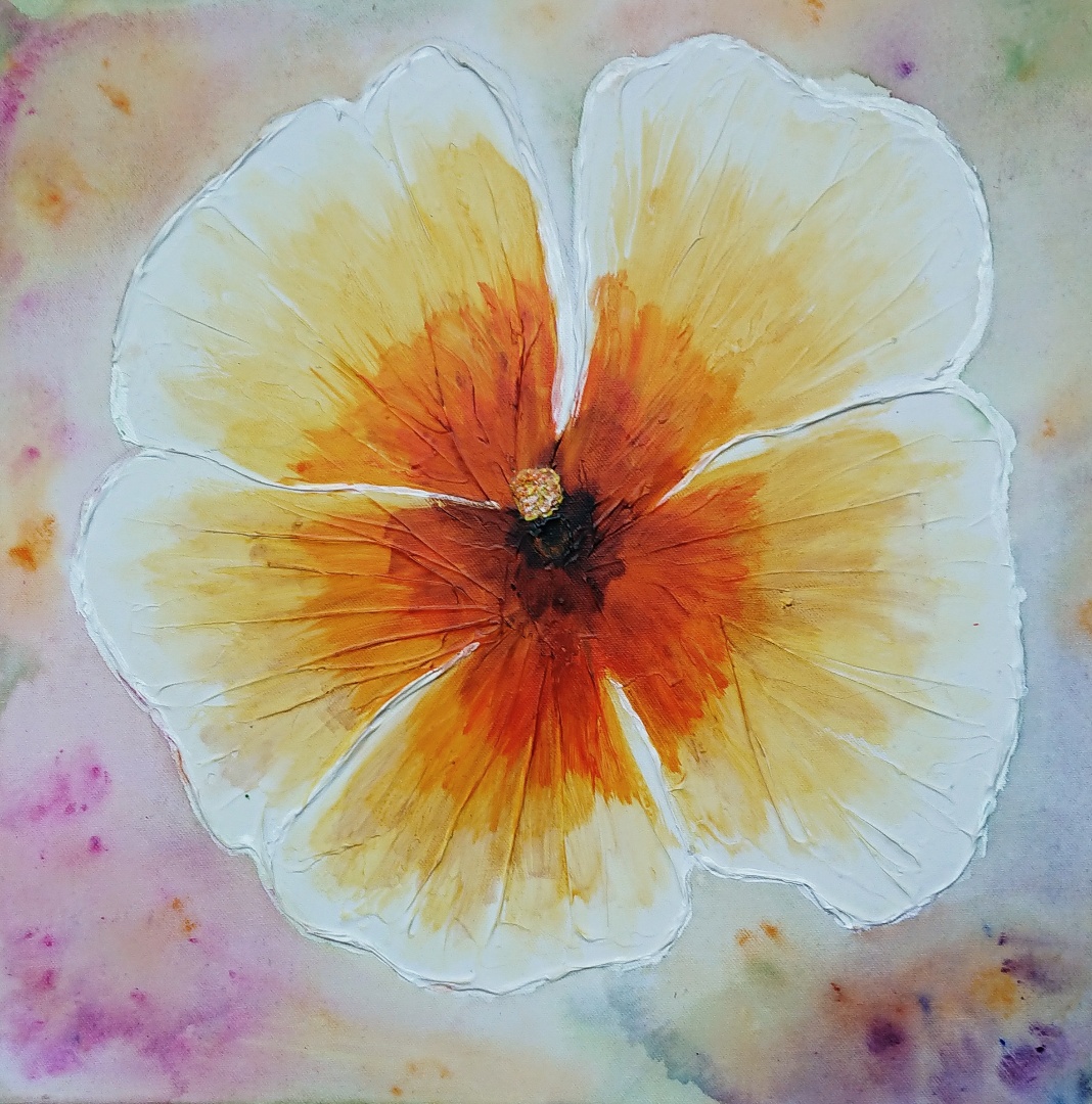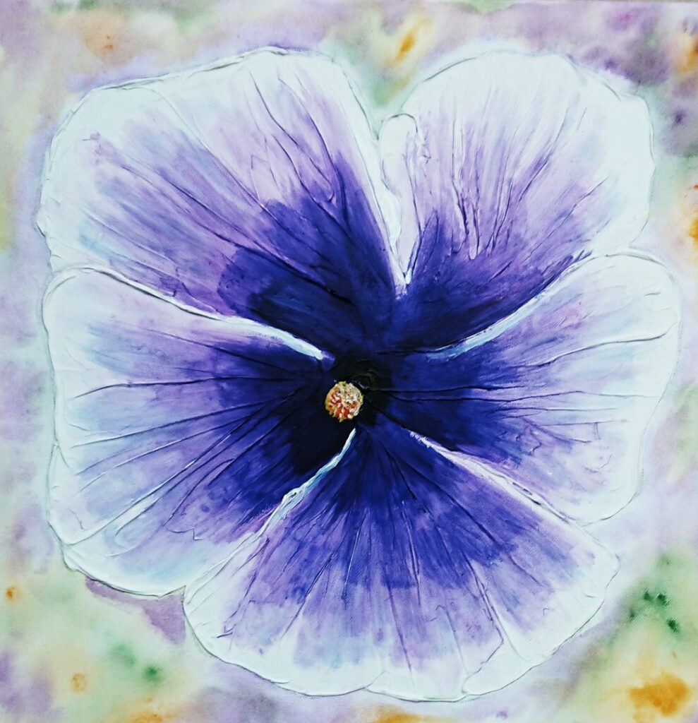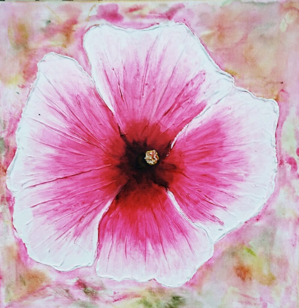 Bei diesen Bildern habe ich die Leinwände nicht vorher grundiert, sondern gleich mit der Strukturpaste die Blumen aufgesetzt. Nach dem Trocknen wurden diese dann jeweils mit den gewünschten Farben ausgestaltet. Zum Schluss habe ich die Hintergründe in einer Naß-in Naß-Technik gearbeitet.