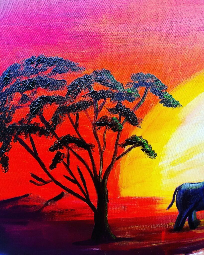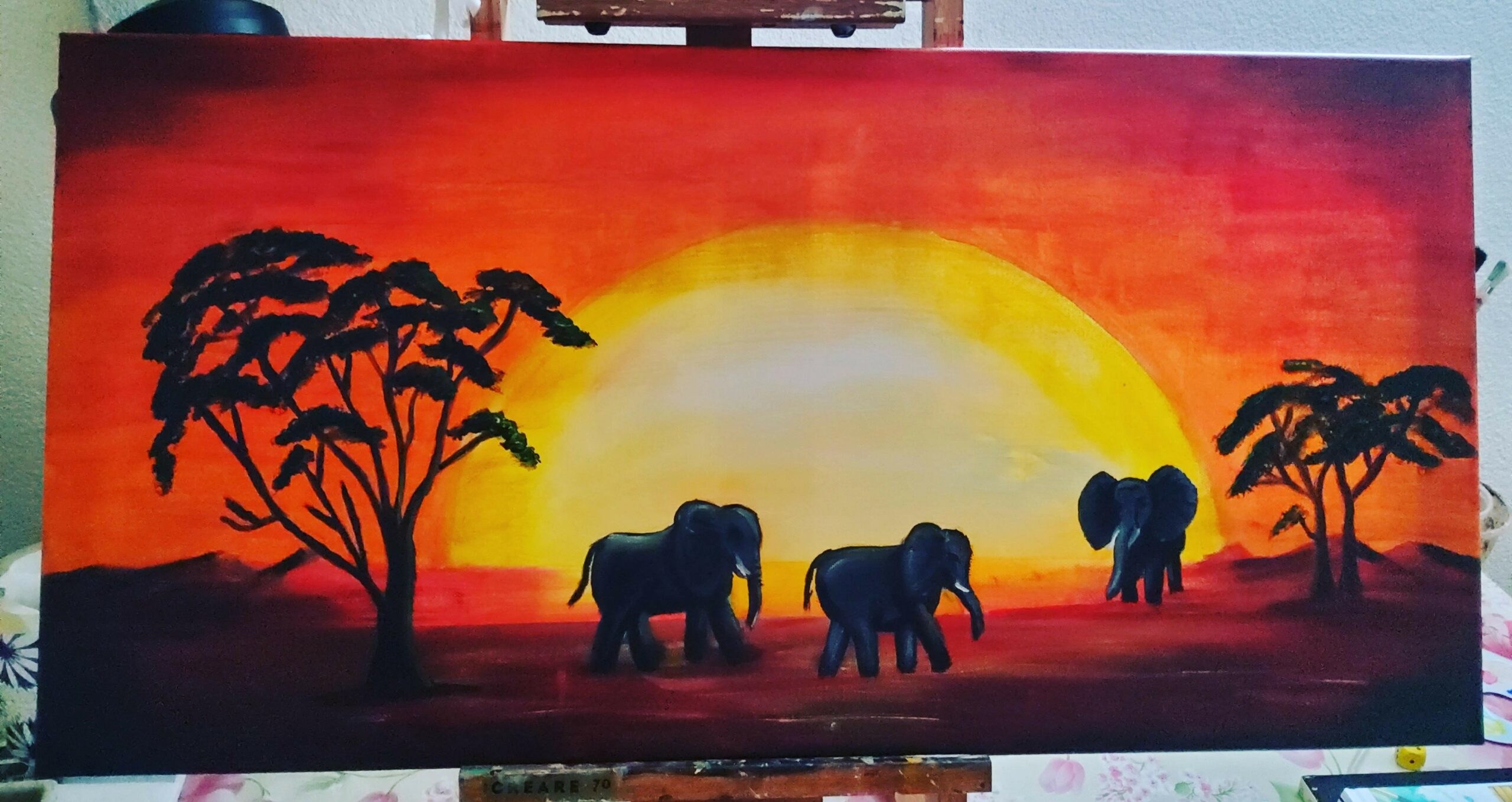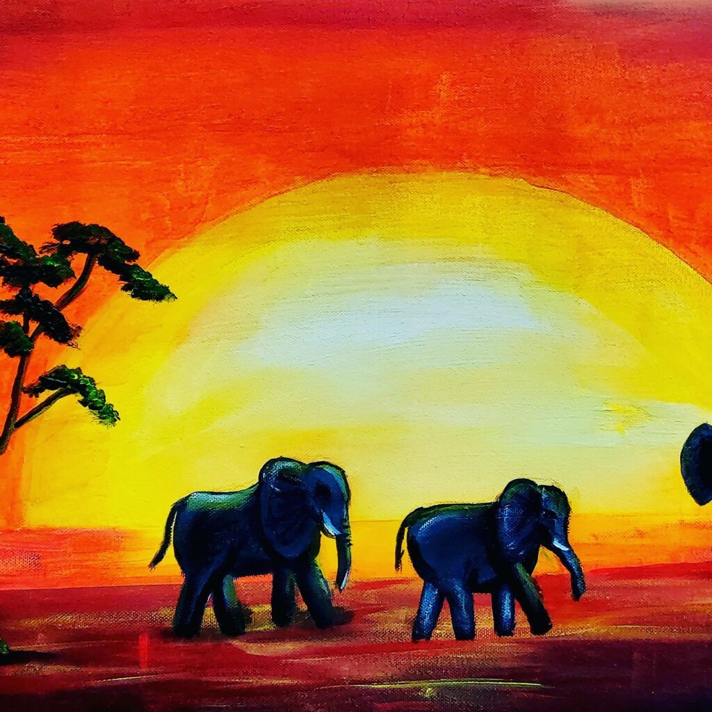 Wie ihr sehen könnt, haben die Elefanten gewonnen :-). Nach dem Vorzeichnen wurden alle Elemente im Detail ausgearbeitet. Tiefe ist durch das Abdunkeln der Außenseiten in das Bild gekommen und die Übergänge der einzelnen Farbflächen habe ich lasiert, damit alles insgesamt weicher und natürlicher wirkt.