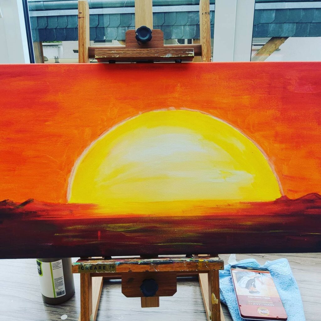 Ich zeige euch anhand der Bilder den Fortschritt und das Entstehen des Bildes. Gearbeitet habe ich mit Acrylfarben auf einer 40 x 80 cm großen Leinwand. Im 1 Schritt habe ich die Farbflächen grob mit den gewünschten Nuancen eingeteilt.