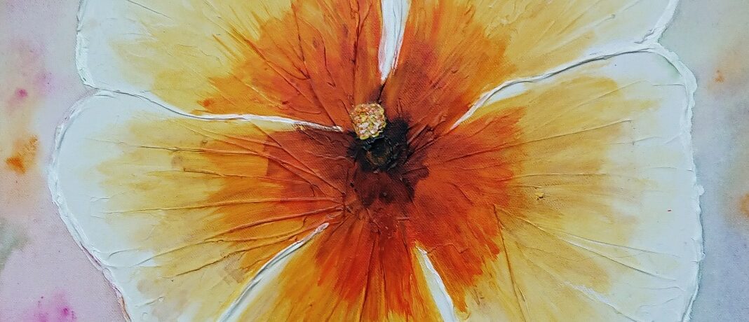 Trilogie Blumen, Acryl mit Strukturpaste auf Leinwand, je 50 x 50 cm Bei diesen Bildern habe ich die Leinwände nicht vorher grundiert, sondern gleich mit der Strukturpaste die Blumen aufgesetzt. Nach dem Trocknen wurden diese dann jeweils mit den gewünschten Farben ausgestaltet. Zum Schluss habe ich die Hintergründe in einer Naß-in Naß-Technik gearbeitet.